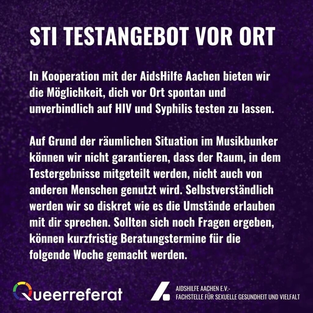 In Kooperation mit der @aidshilfeaachen, bieten wir euch diesmal die Möglichkeit, euch vor Ort spontan und unverbindlich auf HIV und Syphilis testen zu lassen.