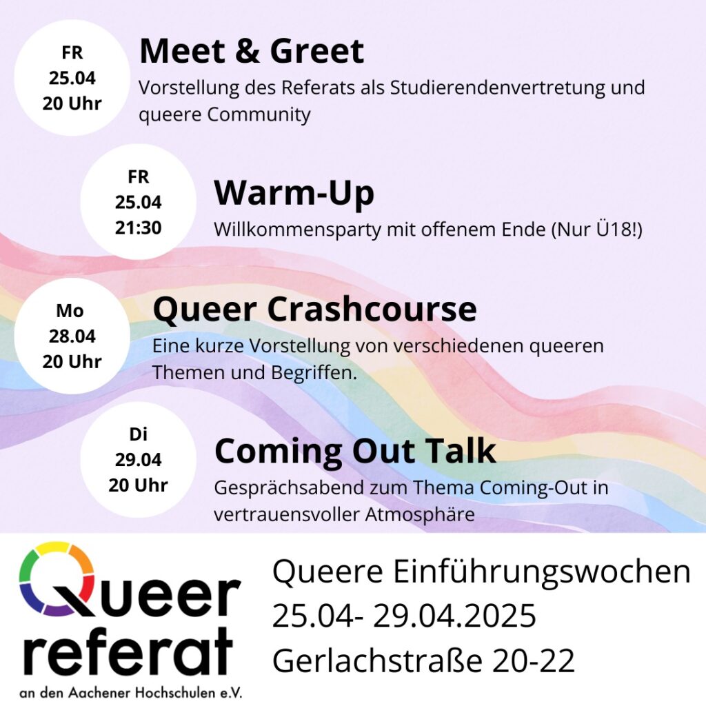 Queerreferat an den Aachener Hochschulen e.V. Sun, 12 Oct 2025 16:28:41 +0000 de hourly 1 https://wordpress.org/?v=6.9.1 /wp-content/uploads/2023/12/logo-150x150.png Queerreferat an den Aachener Hochschulen e.V. 32 32 Queere Einführungswoche WiSe 2025/26 /2025/10/12/queere-einfuehrungswoche-wise-202526/ /2025/10/12/queere-einfuehrungswoche-wise-202526/#respond Sun, 12 Oct 2025 16:21:12 +0000 /?p=5849 Wir starten bald ins neue Semester und wie jedes mal, gibt es bei uns die Einführungswochen mit ein paar spannenden Veranstaltungen.
