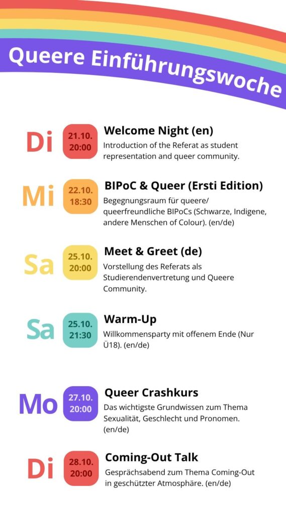 Es gibt zwei Veranstaltungen wo wir das Referat und unsere queere Community allen die noch nie (oder noch nicht so häufig) da waren vorstellen: Die welcome Night auf Englisch und das Meet & Greet auf Deutsch.